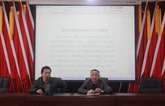 副院长宛锦春领学并详细解读了《新时代高校教师职业行为十项准则》,再学习了《Beat365中文官方网站师德师风负面清单和失范行为处理办法(试行)》的文件内容及精神,要求与会教师进一步提升职业素养,规范从教行为,全方位加强师德师风建设。