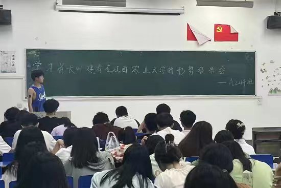 叶建春在江西农业大学形势报告会暨专题党课上的讲话从伟大的变革、奋进的江西、青年的使命三个方面梳理分析,对全省高校深入开展学习贯彻习近平新时代中国特色社会主义思想主题教育提出明确要求,并勉励青年学生从脚下的红土地吸收深厚养分,珍惜时代际遇,勇担责任使命。通过学习,各位同学纷纷表示将会以此次学习为契机,进一步深化学习领会重要精神,增强“四个意识”、坚定“四个自信”、做到“两个维护”,不断提高自身能力建设。