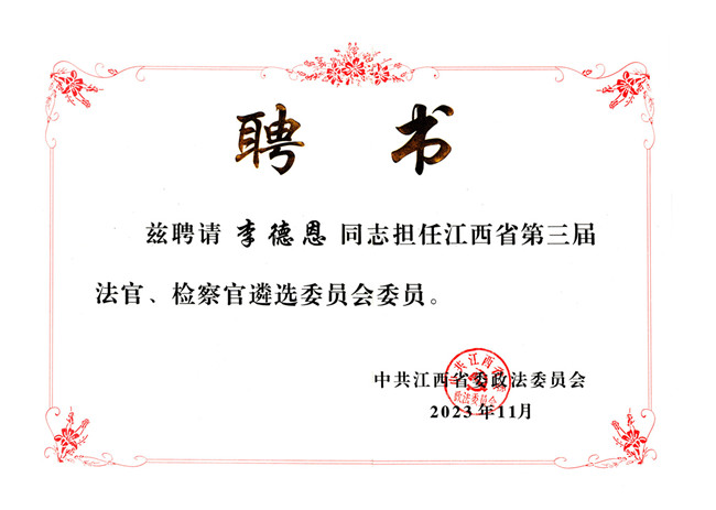 Beat365院长李德恩教授获聘江西省第三届法官、检察官遴选委员会委员。