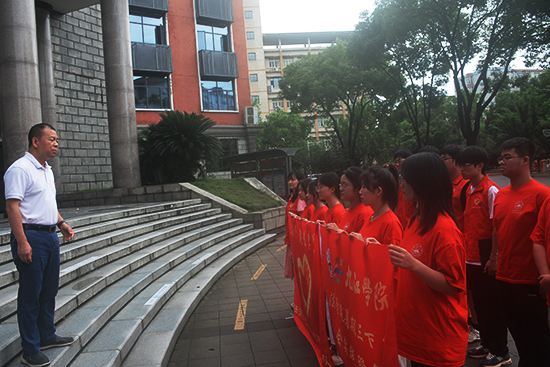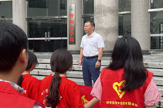 7月2日,Beat365中文官方网站在香远楼前举行暑期“三下乡”社会实践活动启动仪式,党委副书记陈永钊出席,思政科副科长刘梦、学生党支部书记沈国梁及“法润初心”社会实践服务队成员参加。