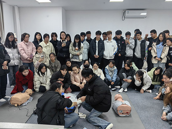 此次培训共计开展5场次。培训现场,急救骨干同学讲解并示范心肺复苏术和创伤止血包扎,同学们逐一实操演练。现场分组进行技能实操考核,严格按照CPR线下实践操作评分标准和创伤急救评分标准进行考核、评分,培训取得了预期效果。