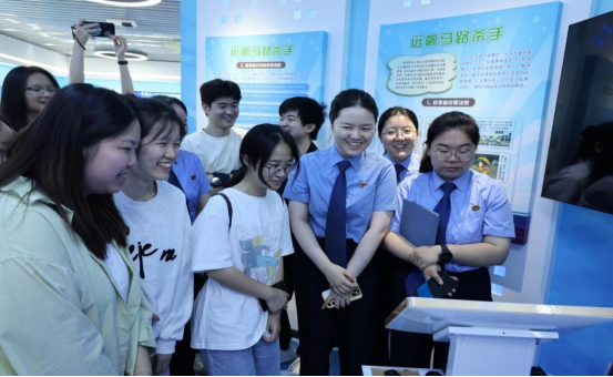 活动伊始,在检察干警的引导下,参观人员首先来到了一楼12309检察服务中心。工作人员详细介绍了中心受理民事申诉、支持起诉等职能,展现了检察机关司法为民的窗口形象。随后,大家来到二楼。“现在您看到的是我们的青少年法制教育基地......"智能机器人小阳正为参观者讲解展区内容。AR技术带来的“危险驾驶体验”让师生们直呼震撼。“通过虚拟现实技术,我们让普法教育从'说教式'转变为'体验式'。”检察官介绍道。基地内,互动答题区、模拟法庭等特色板块,将枯燥的法律条文转化为生动实践。同学们亲身体验了法治教育的趣味性与实用性,深刻感受到检察机关在普法宣传中的创新实践。