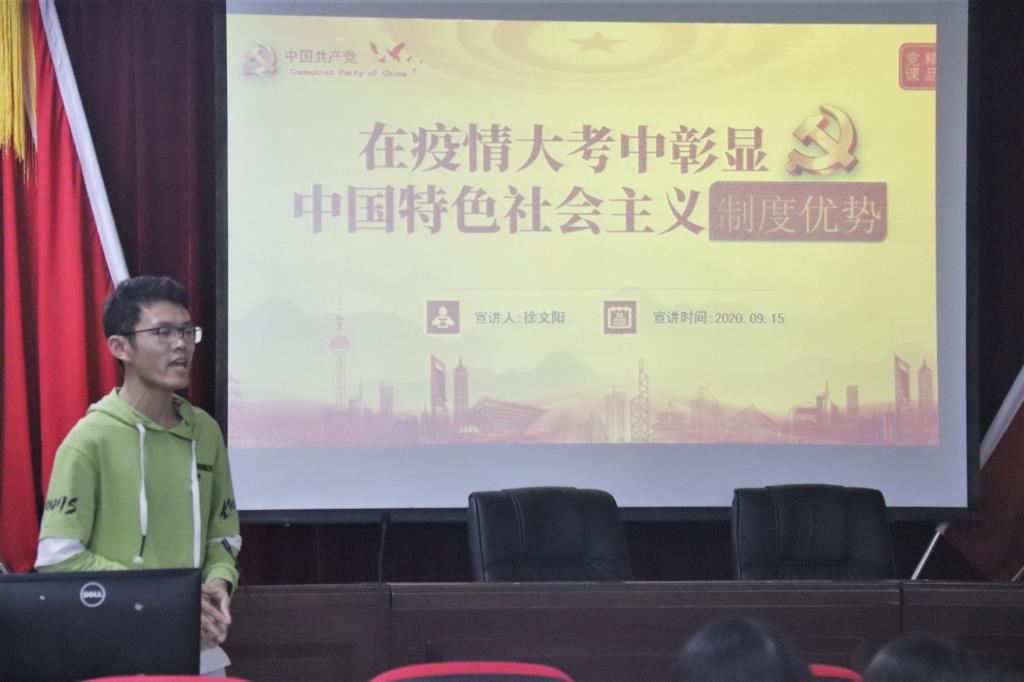 9月16日,徐文阳开展了以“在疫情大考中彰显中国特色社会主义制度优势” 为主题的团课。通过分析新冠疫情下各国的表现,突出在疫情期间党中央的核心领导优势、强大的政治动员优势、组织优势、党密切联系群众优势和全国一盘棋的优势,带领骨干班成员充分认识社会主义制度集中力量办大事的优越性。最后,徐文阳呼吁大家,要坚定政治信仰,拥护中国共产党的领导,树立文化自信与制度自信、践行社会主义核心价值观,为制度的现代化提供软实力。