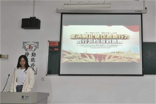各班采用PPT的形式来阐述节约粮食的重要性。有的班级通过向大家展示餐饮浪费的图片及视频反映饮食浪费的现象,同学们深刻感受到粮食浪费的严重性;有的班在学习习总书记对制止餐饮浪费的指示精神后,增强了对粮食的危机意识,将坚持勤俭节约的习惯;有的班向同学们展示了一些制止餐饮浪费的创意设计作品,并号召同学们参与其中,营造崇尚节约的新风尚。
