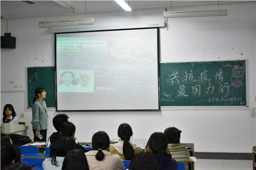 各班团支书首先介绍了本次团会的主题。有的团支书讲述了疫情期间医护人员为救治病人无私奉献的故事,使同学们对逆行的医护人员产生了崇高的敬意。他们不禁感慨道:在疫情之下“哪有什么岁月静好,只不过有人在替你负重前行”;有的团支书以视频的方式向大家科普了疫情防控注意事项,视频最后,是全国人民抗疫即将成功、令人喜悦的画面;有的团支书则组织了一场小型的抗疫知识抢答比赛,同学们调动所有抗疫知识储备,积极抢答应答,将抗疫知识牢记于心。