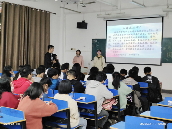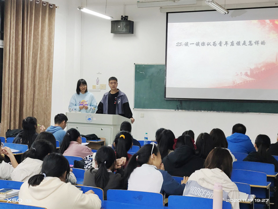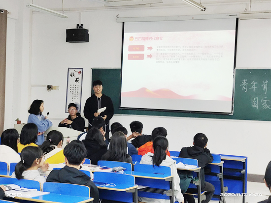 此次活动分为四个部分,内容为学习五四精神、青年勇担当、新时代青年、争做时代青年。在活动中,同学们认真地观看PPT,认真地听班级团支书的讲说。在此次活动中,各班团支书向同学们阐述了五四精神时代内涵及其时代意义,并列举了大量勇于担当勇于献身的古今青年事迹,更好地让同学们了解了五四精神的具体体现。除此之外,此次活动通过大量的视频还原了五四运动时期的场景,令同学们热血沸腾,使“五四精神”深刻地印在同学们的脑海中。