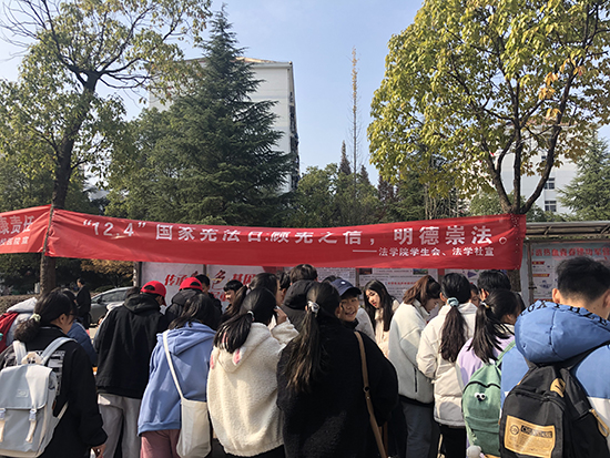 在此次活动前,同学们绘制了相关主题海报,整理了相关法律知识,并将其制作简答题给来往的同学们回答,现场气氛活跃。大家手持中华人民共和国宪法书籍和宣传单,向全院师生宣传宪法知识,签名条幅上也写满了同学们对国家未来美好的祝福。