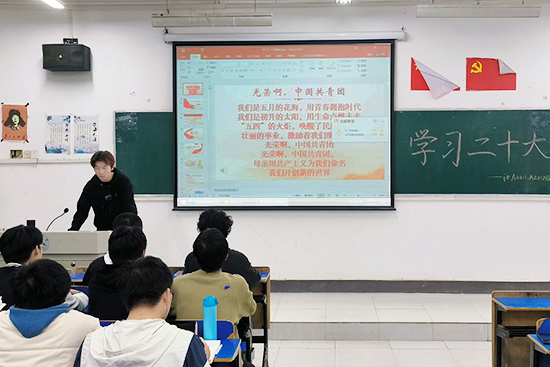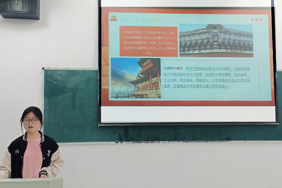 各班团支书首先向同学们介绍了党的二十大主题:高举中国特色社会主义伟大旗帜,全面学习贯彻习近平新时代中国特色社会主义思想,弘扬伟大建党精神,自信自强、守正创新,踔厉奋发、勇毅前行,为全面建设社会主义现代化国家、全面推进中华民族伟大复兴而团结奋斗。随后领学了党的二十大召开的时代背景、重要意义、中国共产党的重要任务、中国式现代化的五个特征以及共同富裕的重要意义等内容。同学们表示,一定将党的二十大精神贯彻到自己的学习生活中,坚定不移跟随党的步伐,做党和国家事业的“接班人”,在全面建设社会主义现代化国家的火热实践中绽放绚丽之花。