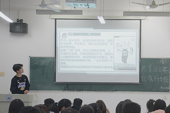 活动中,各班团支部书记带领大家学习了《中国共产主义青年团章程》,呼吁共青团员们树立辩证唯物主义和历史唯物主义的世界观,提醒同学们要时刻保持清醒的头脑和政治警觉,切实做到不信教、不传教。最后,团支书讲述了什么是邪教、邪教的危害,号召青年大学生坚决抵制邪教。