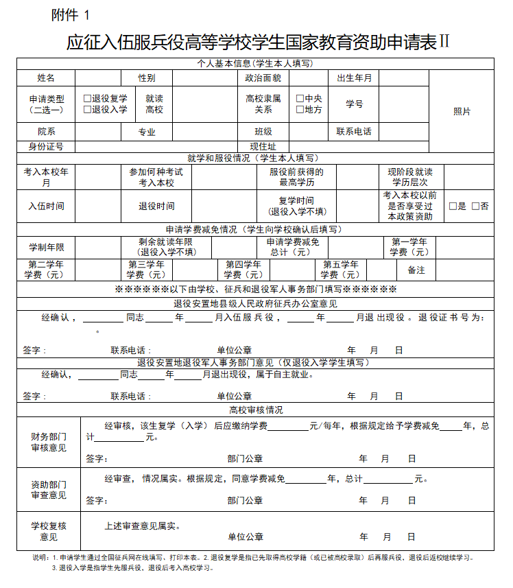 附件:1.应征入伍服兵役高等学校学生国家教育资助申请表Ⅱ