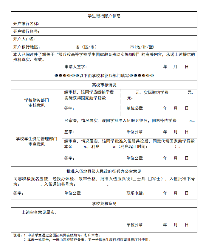 1.应征报名的高校学生登录全国征兵网,按要求在线填写、打印《应征入伍服兵役高等学校学生国家教育资助申请表Ⅰ》(以下简称《申请表Ⅰ》,一式两份)并提交高校学生资助管理部门。在校期间获得国家助学贷款的学生,如选择助学贷款代偿,需同时提供《国家助学贷款借款合同》复印件和本人签字的偿还贷款计划书。《申请表Ⅰ》中填报的学生银行账户信息必须是学生本人社保卡银行卡号或其它正常使用的银行卡号,开户银行名称需写明开户银行支行名称等信息。