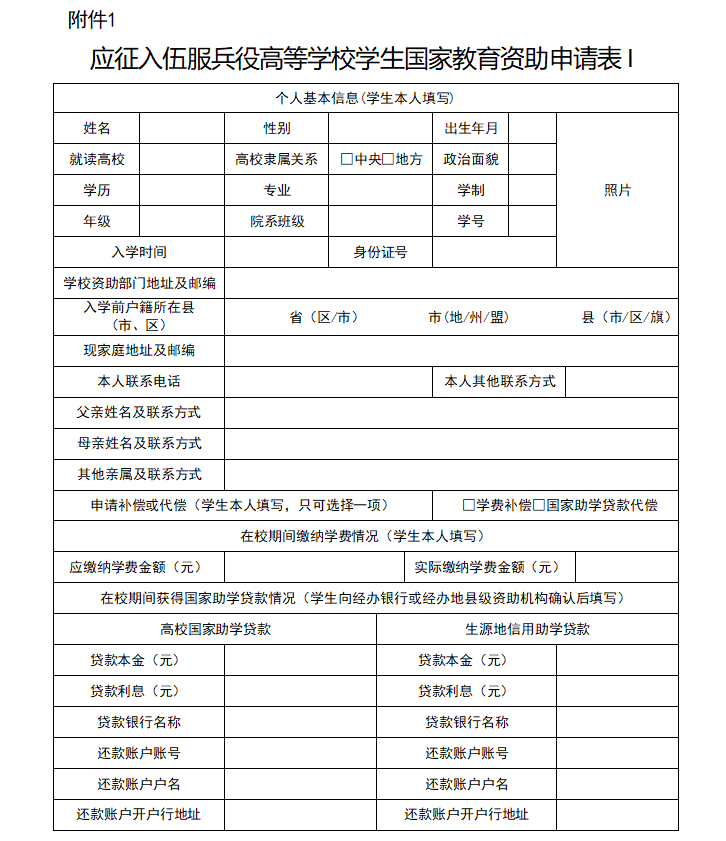 附件:1.应征入伍服兵役高等学校学生国家教育资助申请表Ⅰ